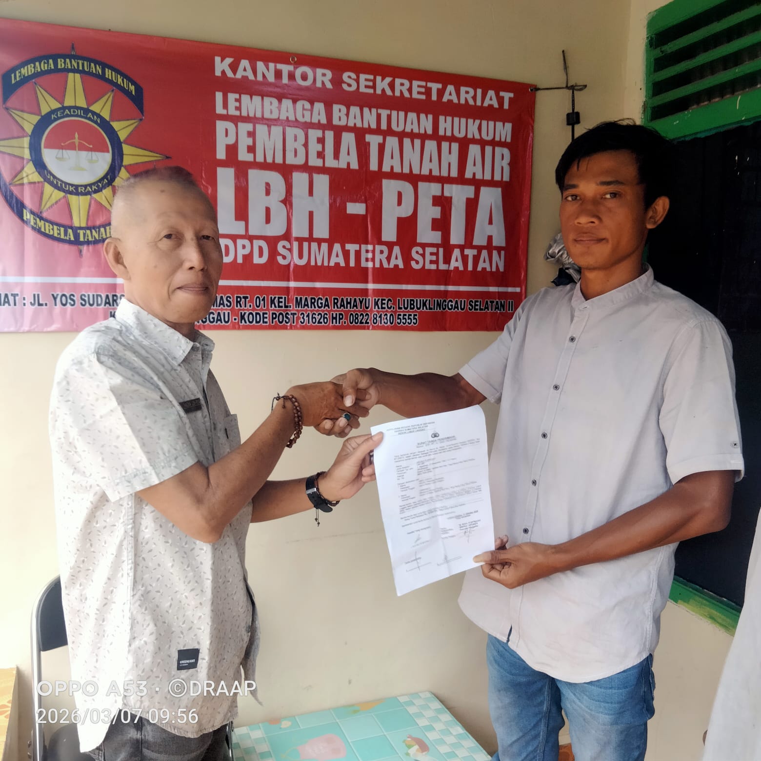 Kedatangan warga tersebut disambut langsung oleh Ketua Tim LBH PETA di sekretariat mereka. Dalam pertemuan tersebut, pihak warga menyampaikan kronologi permasalahan yang dialami serta menunjukkan sejumlah dokumen yang berkaitan dengan laporan yang saat ini sedang diproses oleh pihak kepolisian.