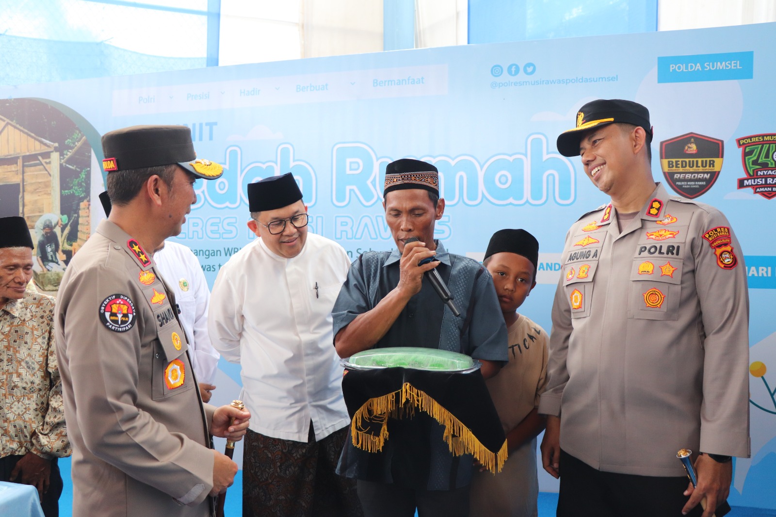 “Getuknya dibawa Kapolda ke Palembang, Beliau antusias dan haru, diberikan getuk, Pak Jumono ini sedang mendapat musibah, rumahnya kebakaran beberapa pekan lalu, saat ini rumahnya sudah selesai kita bantu untuk pembangunan bedah rumah, kebetulan ada kunjungan Kapolda Sumsel ke Polres Musi Rawas, alhamdulillah beliau secara langsung dapat memberikan kunci rumah secara simbolis” ujar Kapolres.