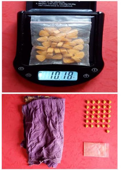 * 31 butir tablet berwarna orange berbentuk segitiga yang diduga kuat merupakan narkotika golongan I jenis Ekstasi dengan berat bruto 10,18 gram.