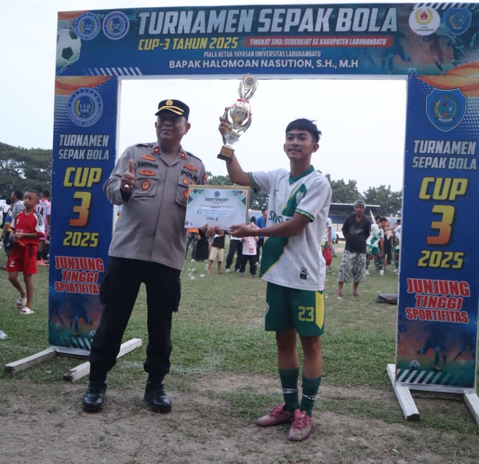 Turnamen tersebut diselenggarakan sebagai wadah pembinaan generasi muda di bidang olahraga, khususnya sepak bola, sekaligus mempererat silaturahmi antar pelajar dan sekolah di wilayah Labuhanbatu Raya. Kehadiran Wakapolres menjadi bentuk dukungan Polri terhadap kegiatan positif yang dapat menumbuhkan semangat sportivitas, disiplin, dan kebersamaan di kalangan pelajar.